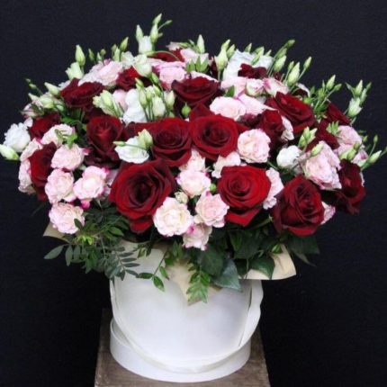 Авторский букет из голубой Гортензии, пионовидных Роз и Хризантемы Момоко