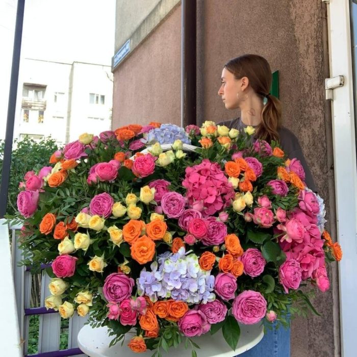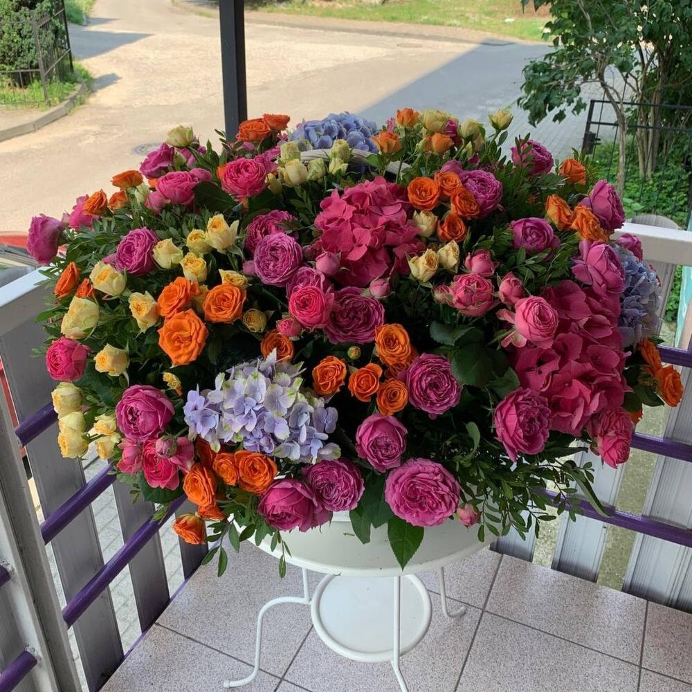 Гортензия – 10 шт.пионовидные розы кустовые Misty Bubbles – 20 шт.розы кустовые кремовые – 15 шт.розы кустовые оранжевые – 15 шт.Пистация пучок – 5 шт.Корзина плетеная – 1 шт.Оазис флористический – 5 шт.
