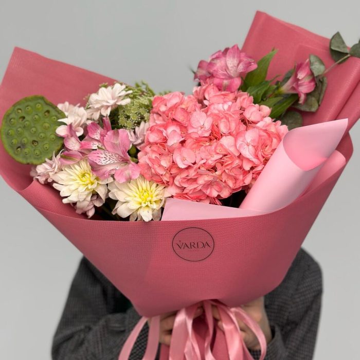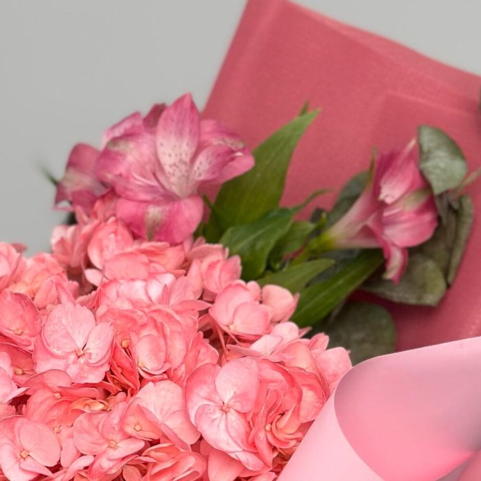 Альстромерии, Гортензии, Кустовые розы, Лизиантусы, Розы, Хризантемы