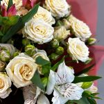 Альстромерия – 6 шт.Роза кустовая – 5 шт.Зелень – 3 шт.Лента атласная – 2 шт.Упаковка дизайнерская – 3 шт.