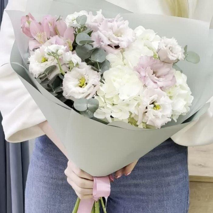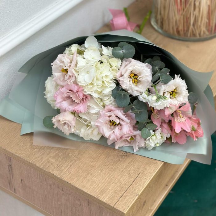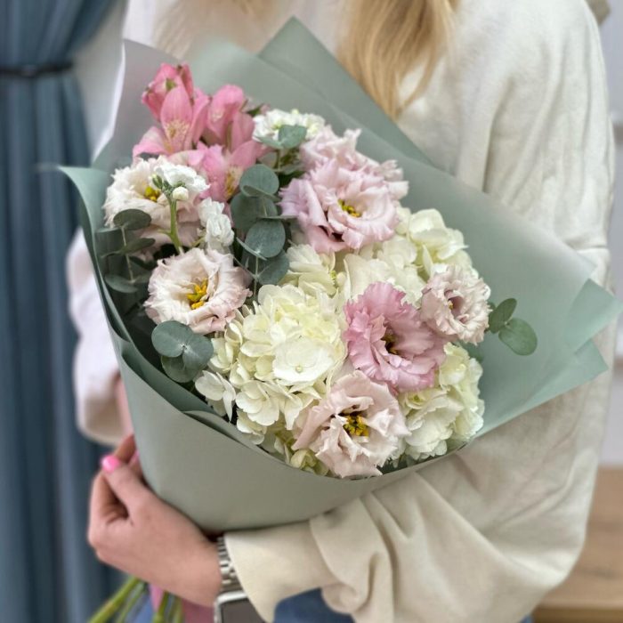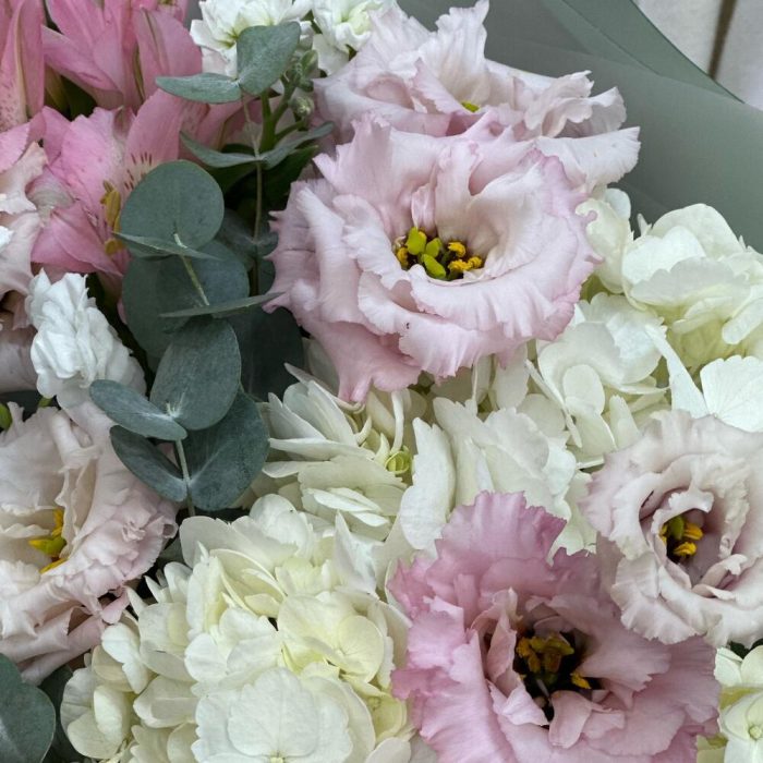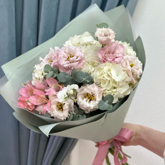 Альстромерия – 1 шт.Гортензия – 1 шт.Эвкалипт – 50 шт.Упаковка – 1 шт.эустома розовая – 2 шт.маттиола кустовая – 1 шт.
