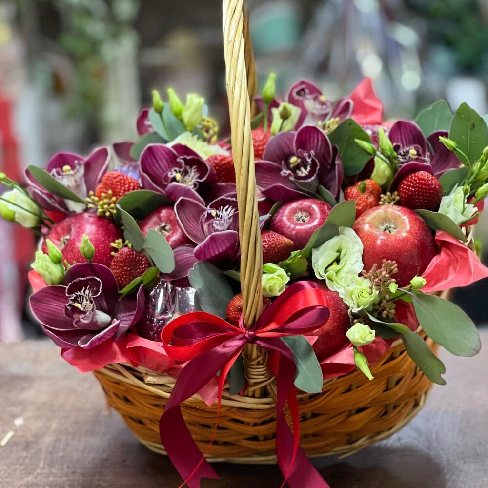 Гранат – 3 шт.яблоки красные – 9 шт.Клубника – 10 шт.Орхидея Цимбидиум – 7 шт.эустома светлая – 11 шт.Корзина – 1 шт.Оазис флористический – 2 шт.Тишью – 5 шт.эвкалипт ветки мини – 7 шт.Лента атласная – 2 шт.работа флориста – 1 шт.