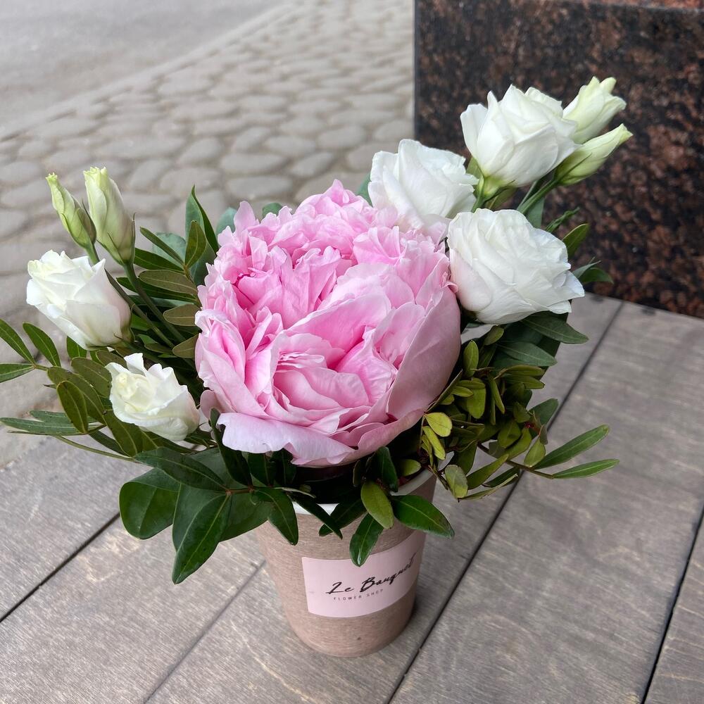 Лизиантус – 1 шт.Пион – 1 шт.Фисташка – 1 шт.Оазис флористический – 1 шт.Стакан крафт дизайнерский – 1 шт.