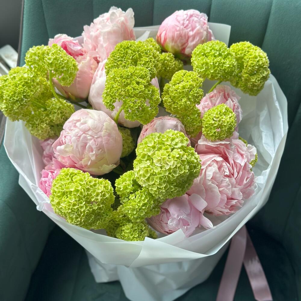 Вибурнум – 4 шт.Пион – 9 шт.Упаковка дизайнерская – 1 шт.Средство для продления жизни цветов – 1 шт.любовь флориста – 100500 шт.