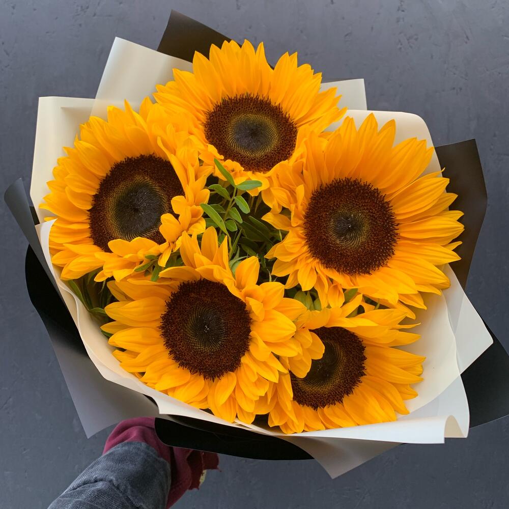 Букет из 15 подсолнухов в стильной упаковке "Пламенное солнце"
