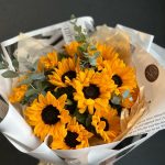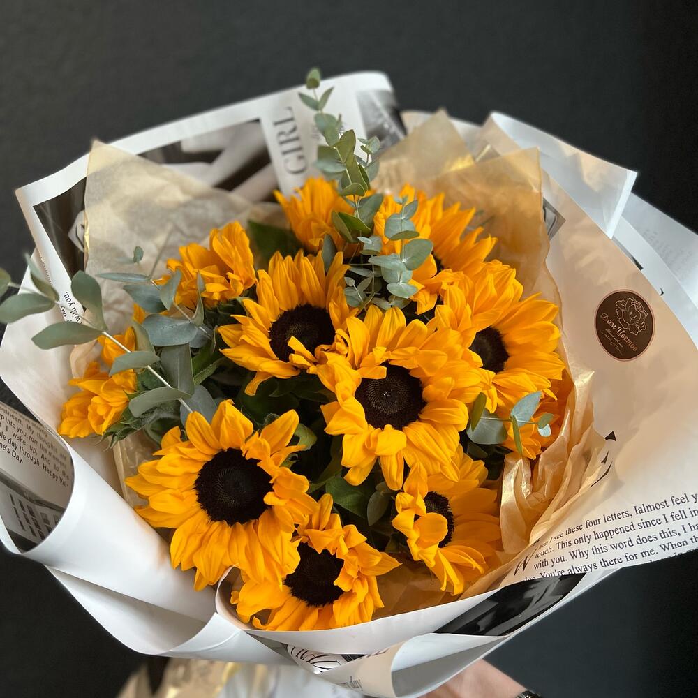 Букет из 15 подсолнухов в стильной упаковке "Пламенное солнце"