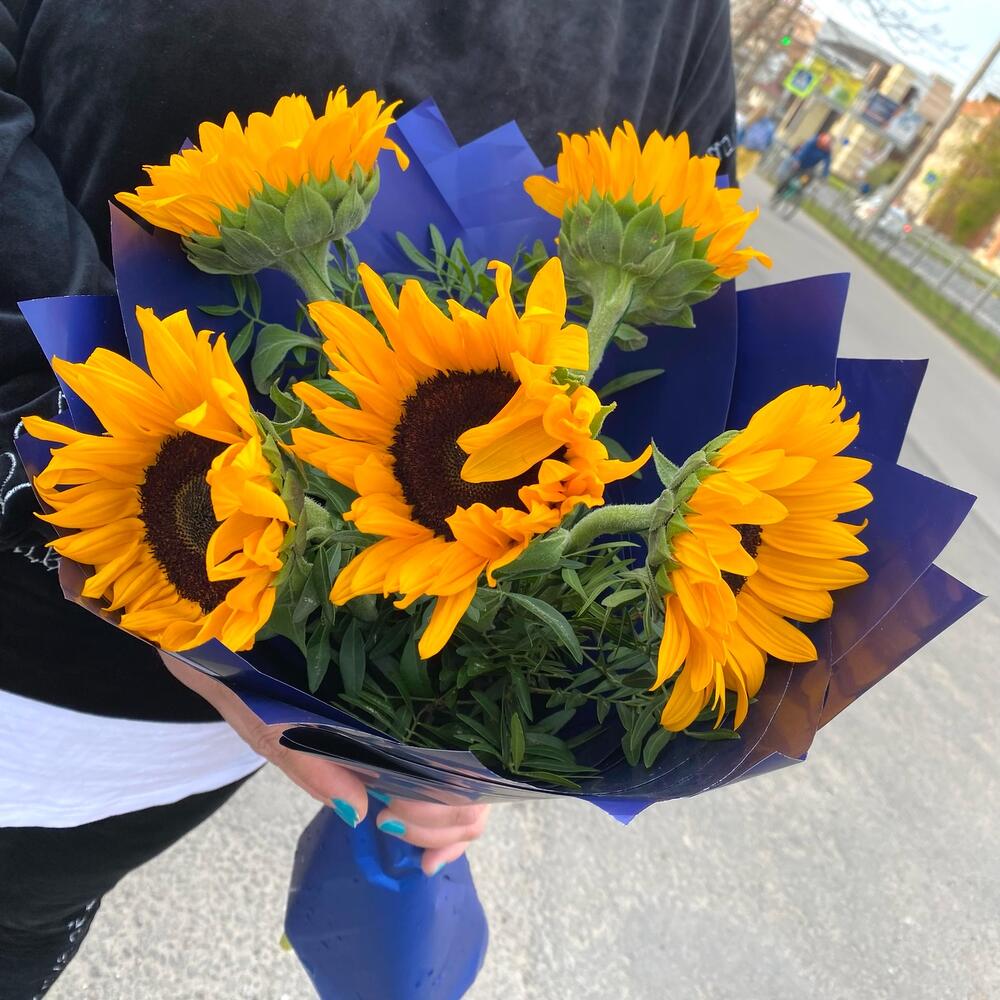 Букет из 5 подсолнухов в стильной упаковке "Эндюранс"