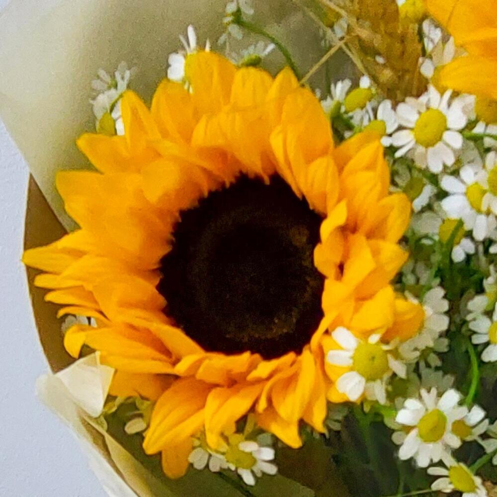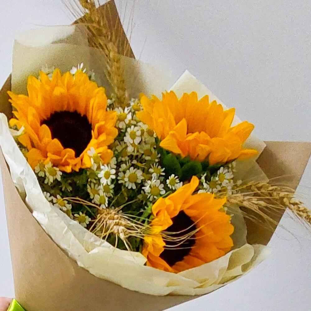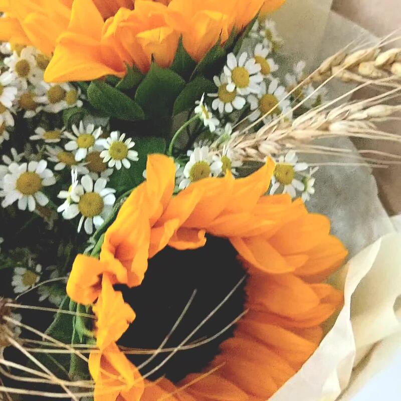 Лента атласная – 2 шт.Тишью – 1 шт.Подсолнух Голландский – 3 шт.Открыточка с вашими пожеланиями – 1 шт.бумага крафт – 1 шт.транспортировочная упаковка – 1 шт.пшеница натуральная – 5 шт.танацетум ромашка – 5 шт.