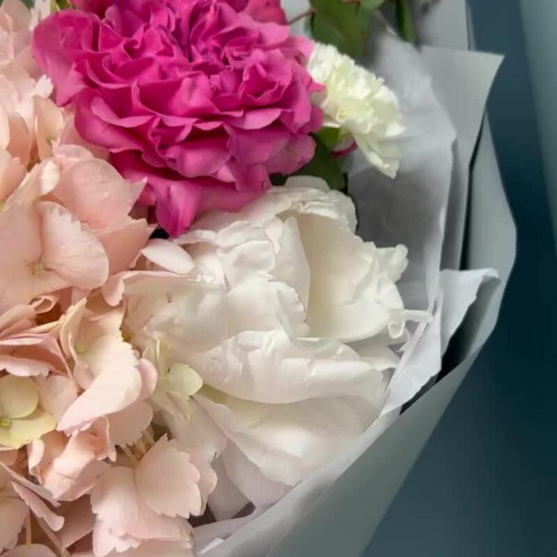Эвкалипт – 1 шт.Сирень – 1 шт.Пион – 3 шт.роза кантри блю – 1 шт.Роза кустовая – 2 шт.Упаковка дизайнерская – 2 шт.Тишью – 3 шт.