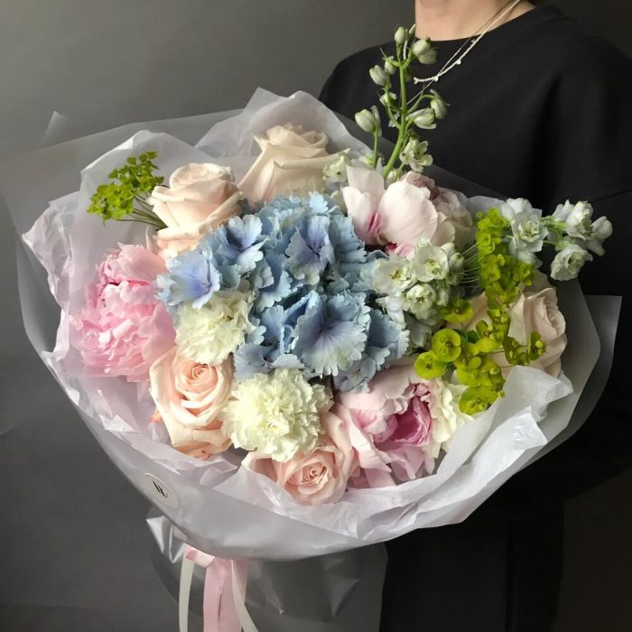 Роза одноголовая – 5 шт.Пион – 3 шт.Гортензия – 1 шт.Дельфиниум – 3 шт.Диантус – 5 шт.Эуфорбия – 3 шт.Упаковка дизайнерская – 1 шт.Лента атласная – 1 шт.Открыточка с вашими пожеланиями – 1 шт.