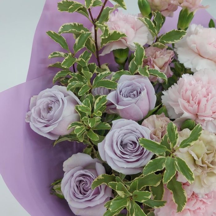 Хризантема одноголовая – 1 шт.Роза кустовая – 1 шт.гвоздика сортовая (диантус) – 5 шт.Гвоздика кустовая – 2 шт.зелень питтоспорум – 1 шт.зелень пистация – 2 шт.Упаковка пленка матовая – 3 шт.Лента атласная – 2 шт.