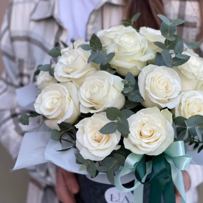Белые кустовые розочки с эвкалиптом в коробке XS