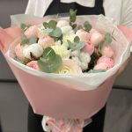 Хлопок – 4 шт.Ранункулюс – 2 шт.роза пионовидная мэнсфилд парк – 3 шт.Диантус – 4 шт.Эвкалипт – 3 шт.Тишью – 3 шт.Пленка матовая – 3 шт.Лента атласная – 2 шт.
