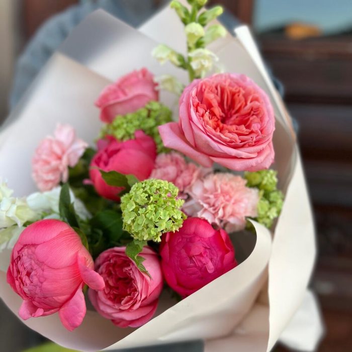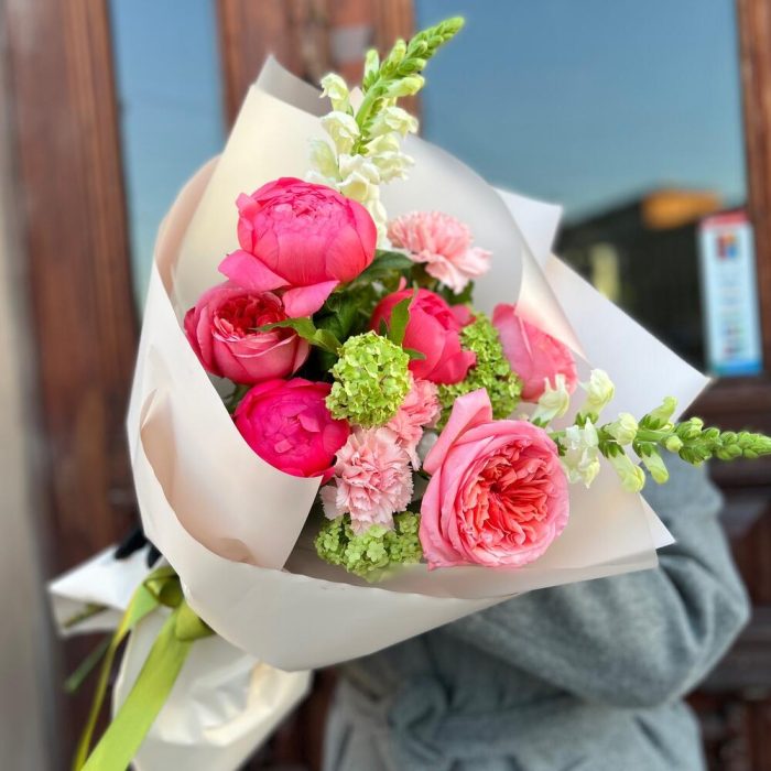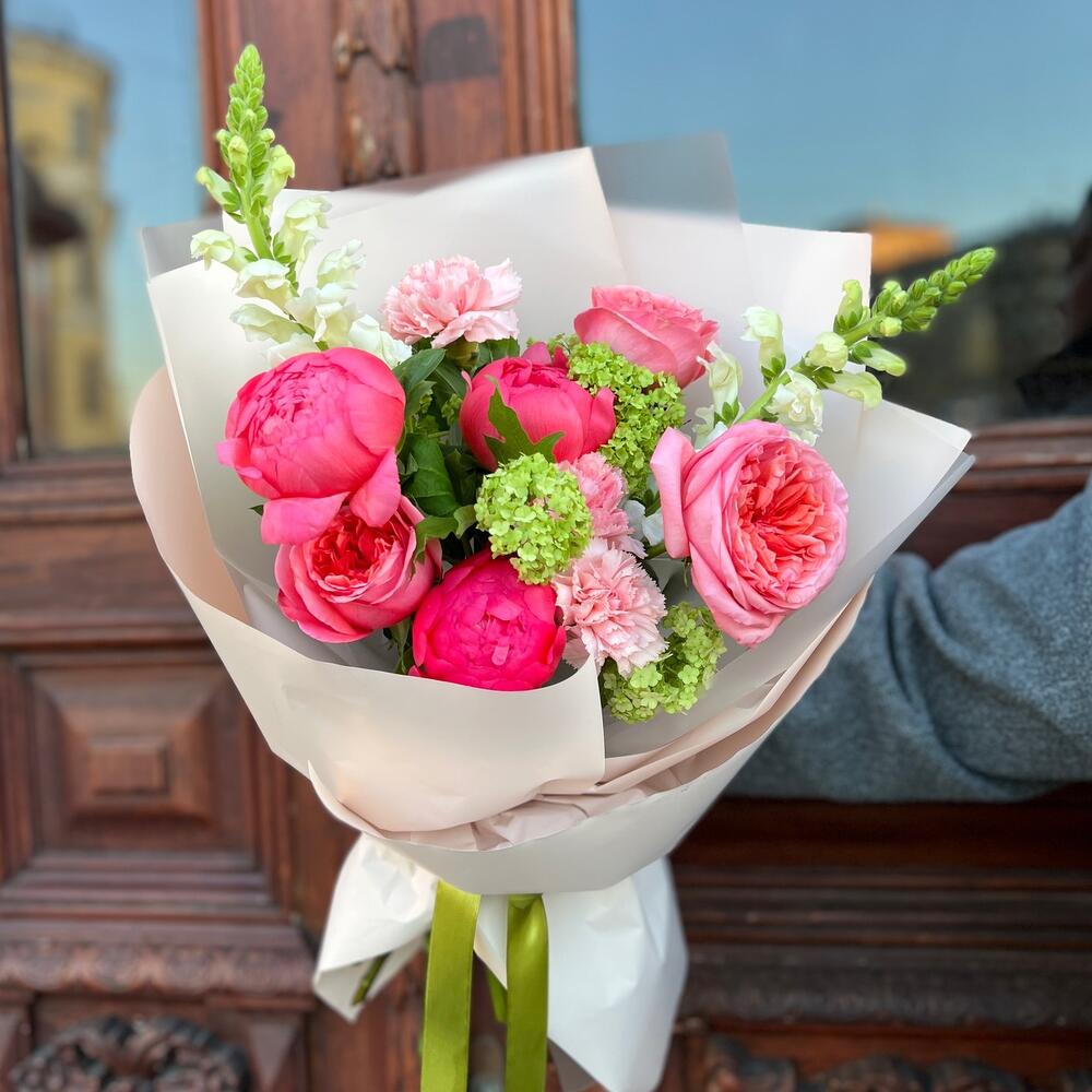 Вибурнум – 1 шт.Лента атласная – 2 шт.Диантус – 3 шт.Пленка матовая – 5 шт.Пион коралл шарм – 3 шт.антиринум – 2 шт.роза пионовидная пинк экспрешн – 3 шт.