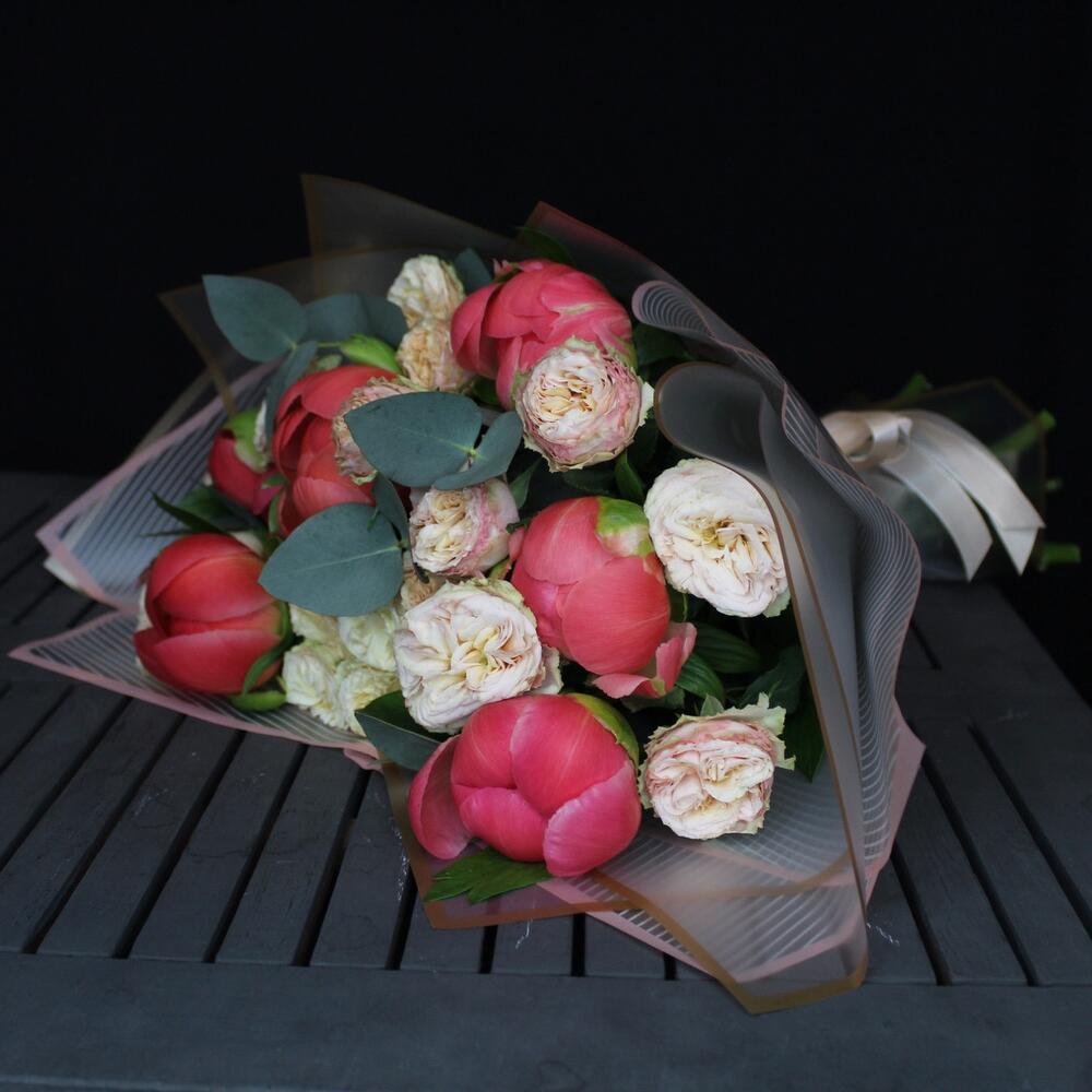 пионы Коралл шарм – 7 шт.роза пионовидная кустовая трендсеттер – 4 шт.Эвкалипт – 3 шт.Пленка матовая – 3 шт.Лента атласная – 2 шт.