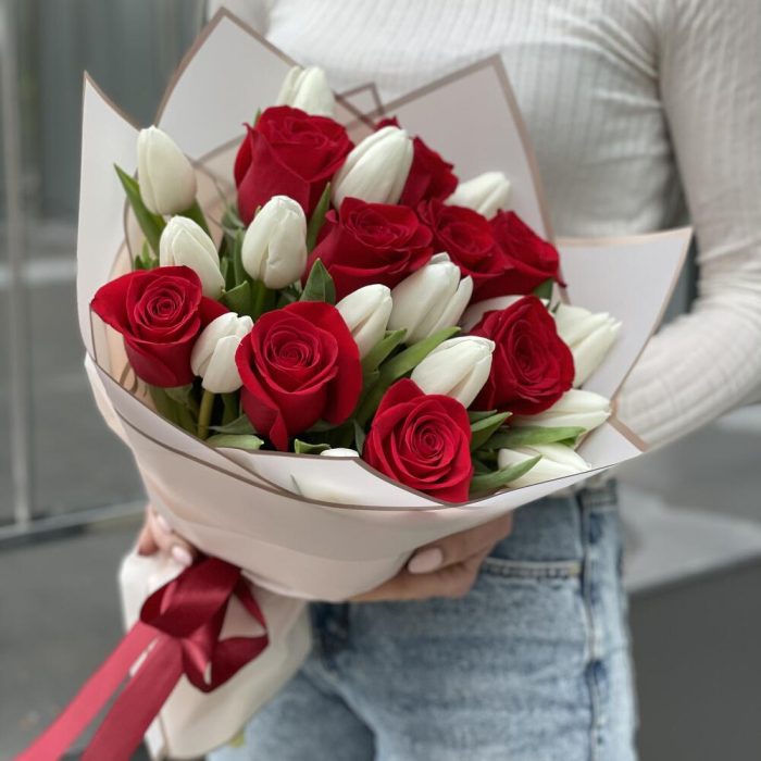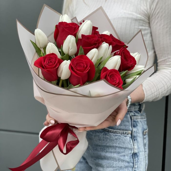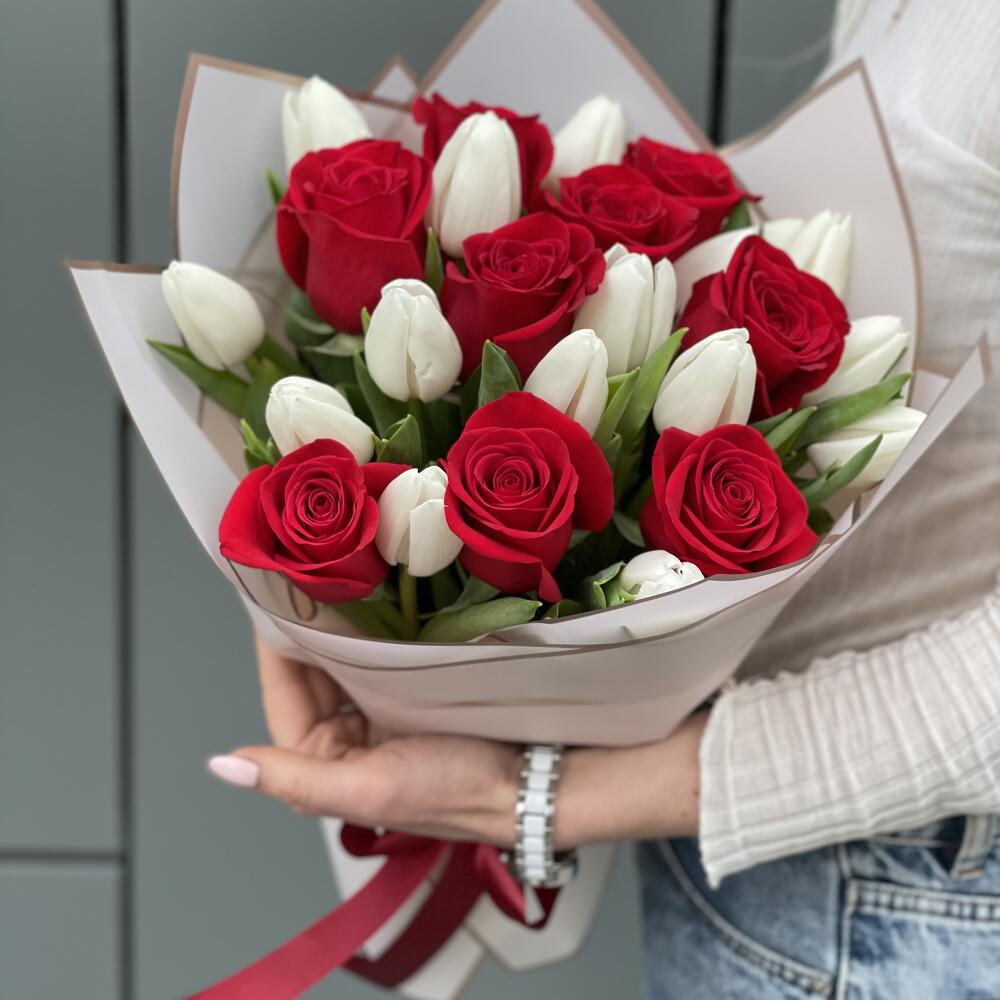 Оформление – 1 шт. Тюльпан белый (голландия) – 16 шт. красная роза сорта фридом – 9 шт.