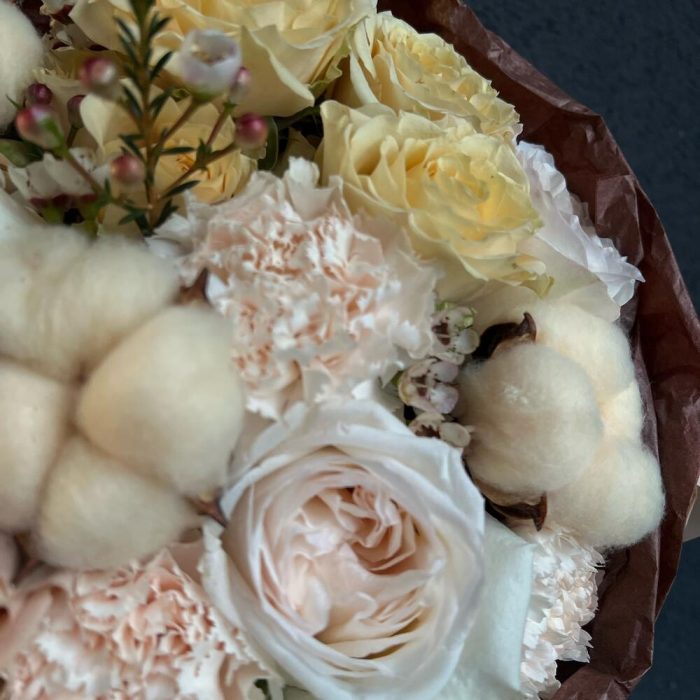 Букет из ароматных пионовидных роз и хлопка «Капуччино»