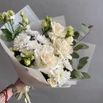 Букет из белых роз, хризантемы и эустомы