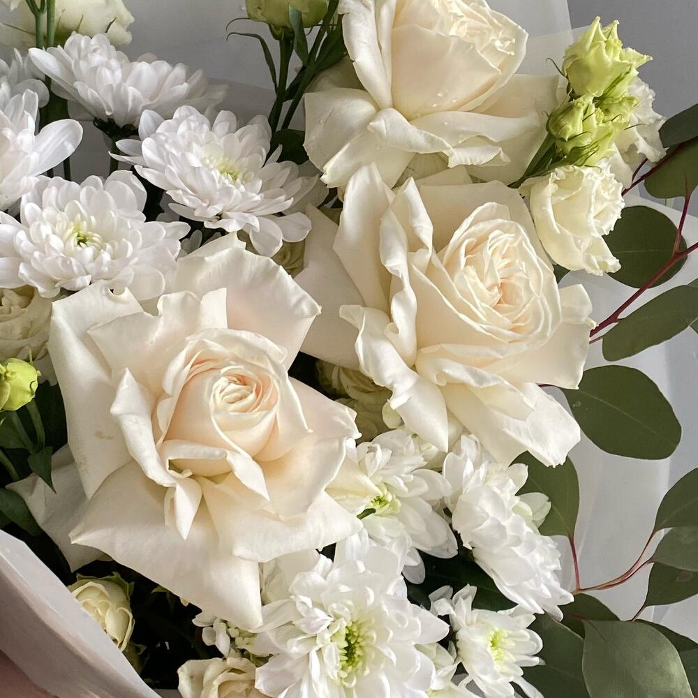 Хризантема кустовая – 2 шт.Эвкалипт – 1 шт.Кустовая роза – 2 шт.Роза белая – 3 шт.эустома белая – 2 шт.