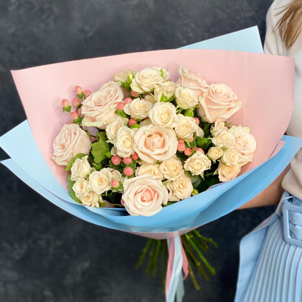 Лента атласная – 2 шт.Упаковка дизайнерская – 1 шт.Гиперикум розовый – 4 шт.Роза Талея 50 см – 7 шт.роза кустовая кремовая грация – 6 шт.