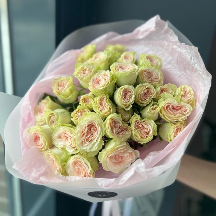 Букет из кустовой пионовидной розы Джульетта и эвкалипт