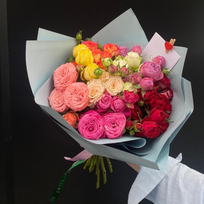 Упаковка дизайнерская – 3 шт. Пионовидная кустовая роза – 9 шт. Открыточка с вашими пожеланиями – 1 шт. инструкция по уходу за цветами – 1 шт.