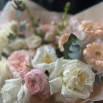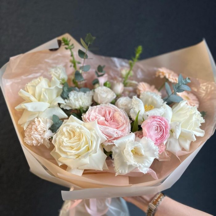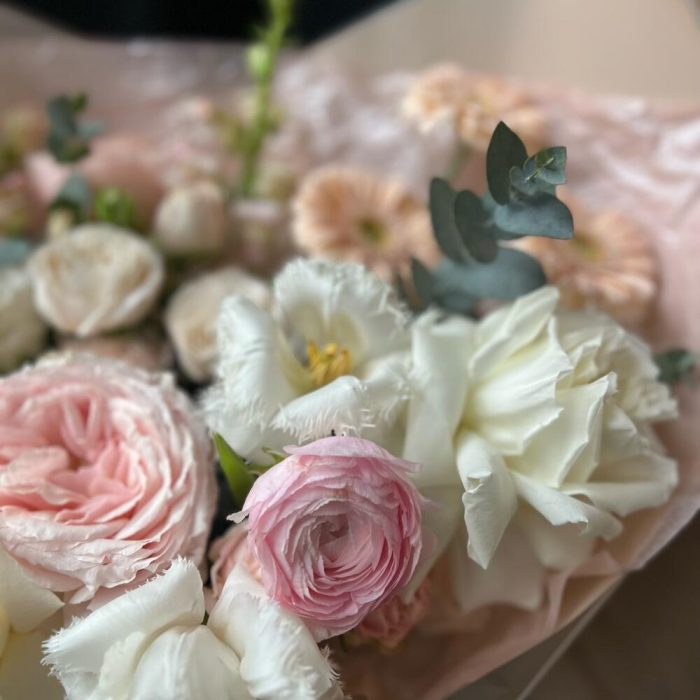 Пионовидная роза – 5 шт.Кустовая роза – 1 шт.Гербера – 3 шт.Диантус – 3 шт.Ранункулюс – 1 шт.Эустома – 1 шт.антиринум – 2 шт.тюльпаны – 2 шт.Эвкалипт – 1 шт.декоративная упаковка – 1 шт.Атласная лента – 1 шт.