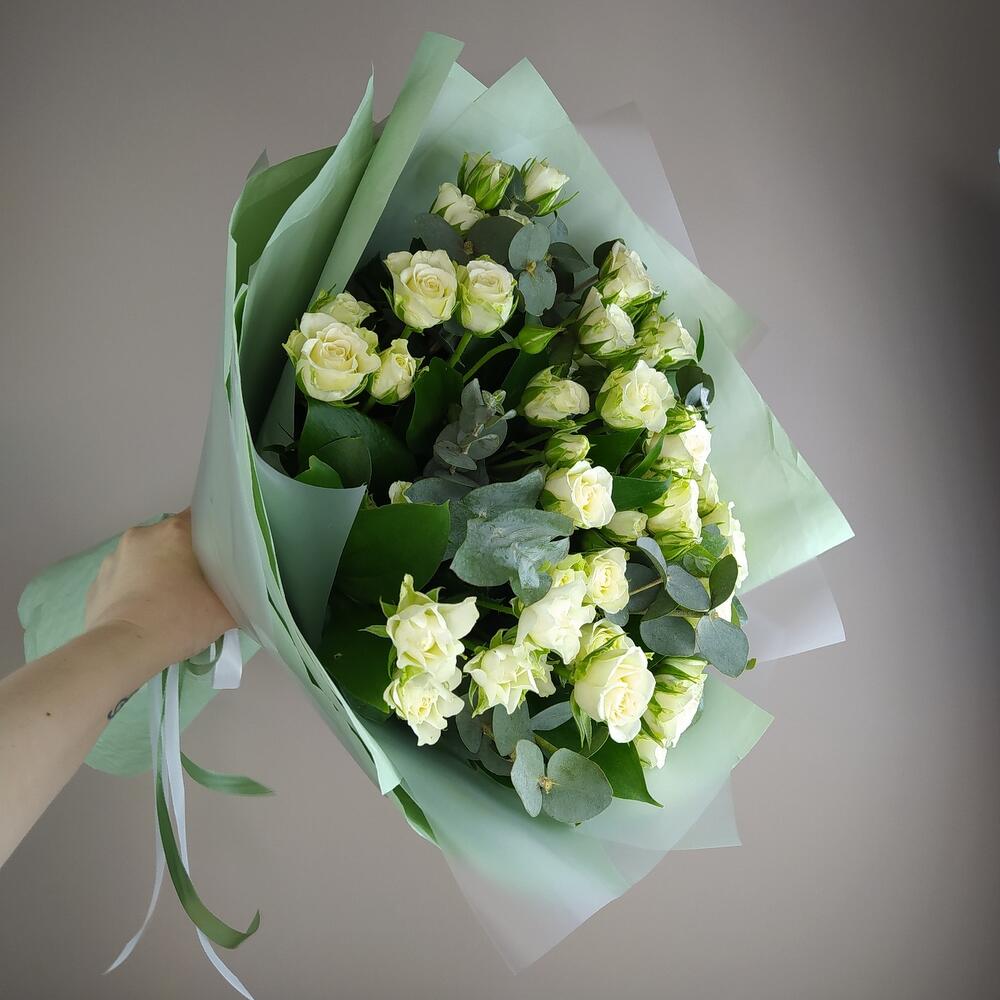 Роза кустовая – 11 шт.Эвкалипт – 5 шт.Зелень – 3 шт.Лента атласная – 2 шт.Упаковка дизайнерская – 2 шт.