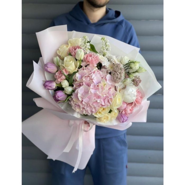 Гвоздики, Лизиантусы, Розы, Тюльпаны