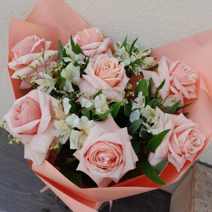 Альстромерия – 6 шт.Лимониум – 3 шт.Лента атласная – 2 шт.Упаковка дизайнерская – 3 шт.Роза французская – 7 шт.
