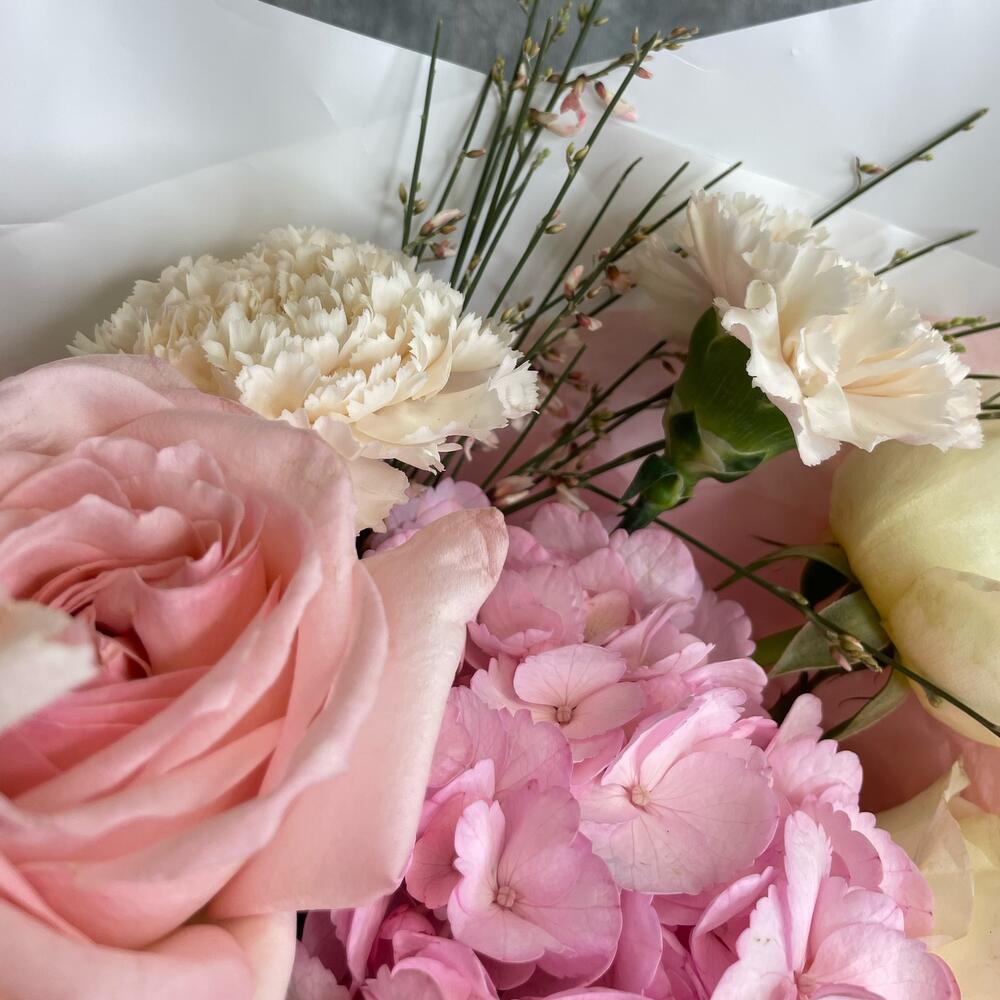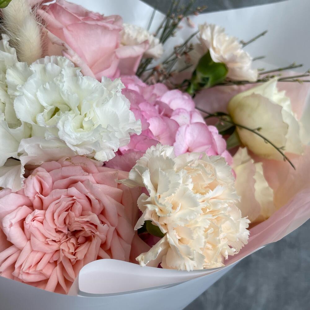 Pink O’Hara роза – 4 шт.white o’hara – 2 шт.Гвоздика – 3 шт.Гортензия – 1 шт.Лизиантус – 2 шт.Лагурус – 5 шт.Гениста – 3 шт.Упаковка дизайнерская – 1 шт.Лента атласная – 2 шт.