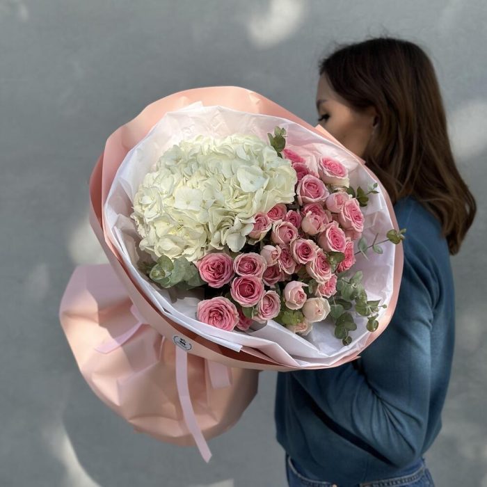 Изысканный букет из гортензии и спрей роз в нескольких оттенках.