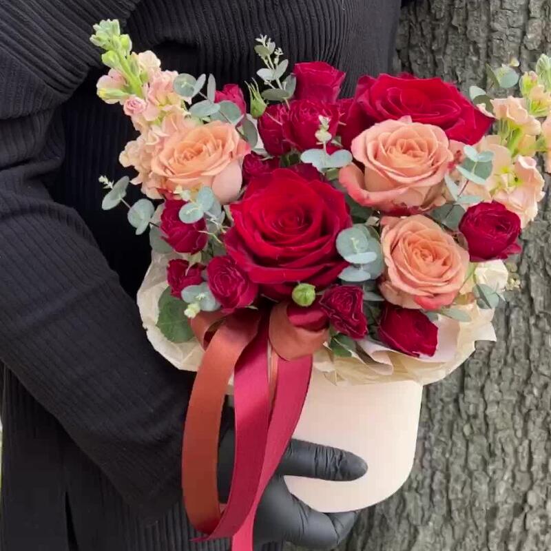 Маттиола – 2 шт.Роза Капучино – 3 шт.Эвкалипт – 3 шт.Лента атласная – 2 шт.Коробка шляпная – 1 шт.Роза Эксплорер – 3 шт.Оазис флористический – 1 шт.роза кустовая пионовидная ред трендсеттер – 2 шт.