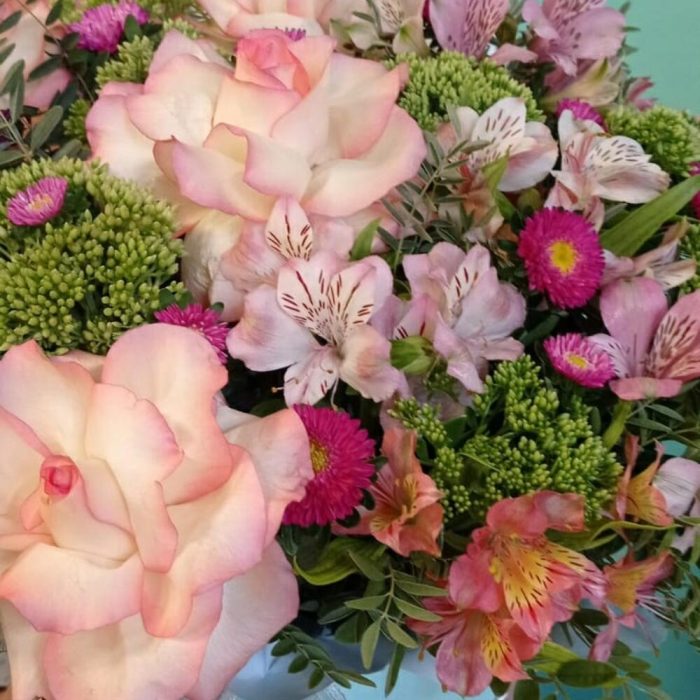 Великолепное сочетание розы Джумилия с розовой альстермерией, не оставит равнодушным ваших любимых людей