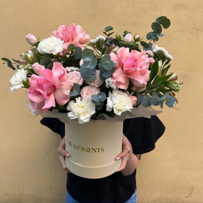 “Атлас☁️” – цветочная композиция с зефиром в деревянном ящике