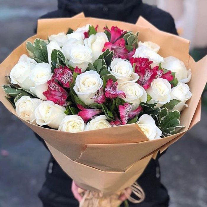 Альстромерия – 4 шт. Лента – 1 шт. Бумага – 3 шт. Роза одноголовая местная 60 см – 21 шт.