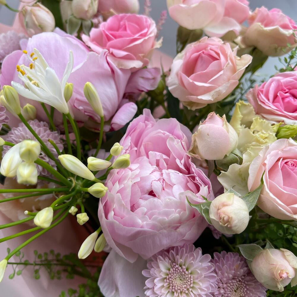 Пион Сара Бернар розовый – 3 шт.Вибурнум – 1 шт.Агапантус – 3 шт.Астранция – 2 шт.Гринбелл – 1 шт.Астильба – 2 шт.Сантини – 3 шт.Роза кустовая – 2 шт.Упаковка дизайнерская – 1 шт.Лента атласная – 2 шт.
