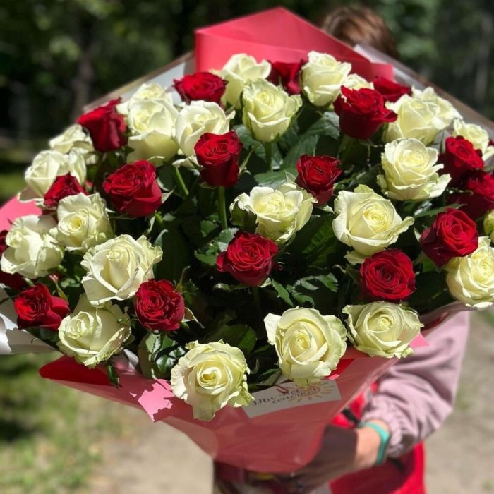 Современная упаковка – 1 шт. красная и белая роза – 51 шт.