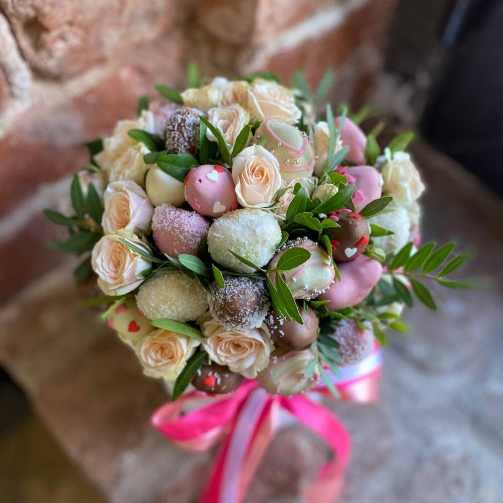 Композиция из клубники в шоколаде, мяты и кустовых роз “Эвредика”