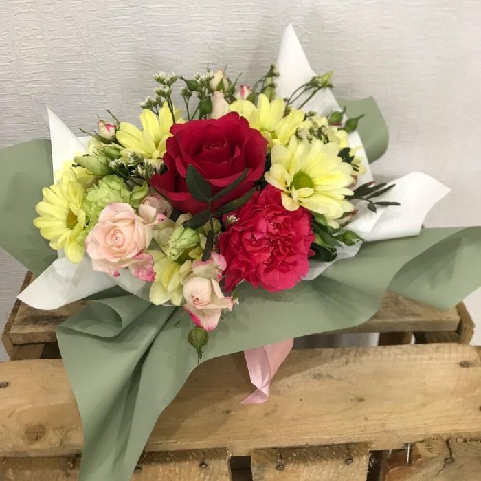 Хризантема кустовая – 1 шт.Хризантема Сантини – 1 шт.Фисташка – 2 шт.Упаковка дизайнерская – 1 шт.Оазис флористический – 1 шт.Лизиантус алиса пинк – 1 шт.роза кустовая кения 60 см – 2 шт.гвоздика стандарт – 3 шт.гвоздика moon – 2 шт.роза хот эксплорер 60 см – 1 шт.