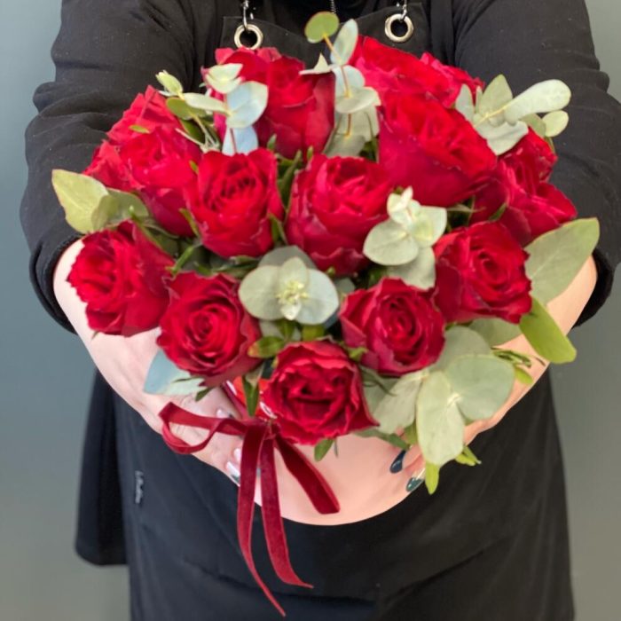 Композиция в шляпной коробке из 19 роз “Алые розы”