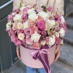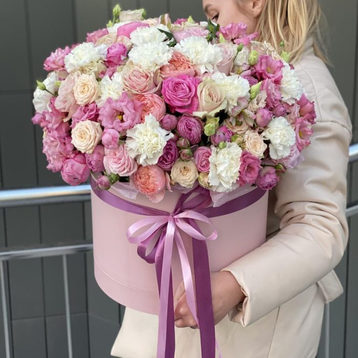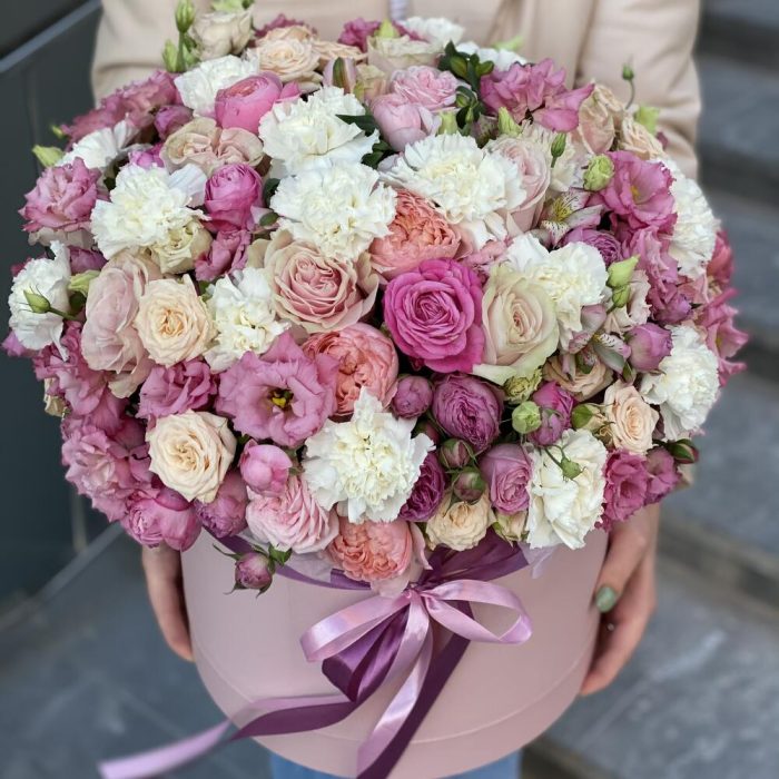 Кустовая пионовидная роза – 29 шт. Одноголовая роза – 13 шт. Гвоздика – 11 шт. Коробка – 1 шт. Оазис – 4 шт. Альстромерия – 3 шт. эустома алиса роуз – 10 шт.