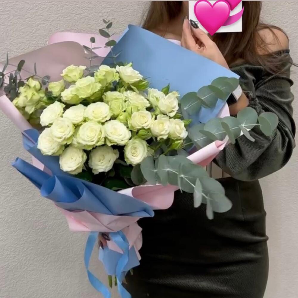 Роза кустовая – 7 шт.Эвкалипт – 1 шт.Упаковка дизайнерская – 2 шт.Лента атласная – 1 шт.