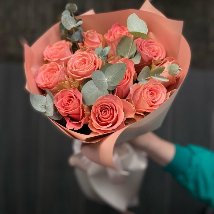 Роза – 11 шт. Эвкалипт – 5 шт. Упаковка дизайнерская – 1 шт.