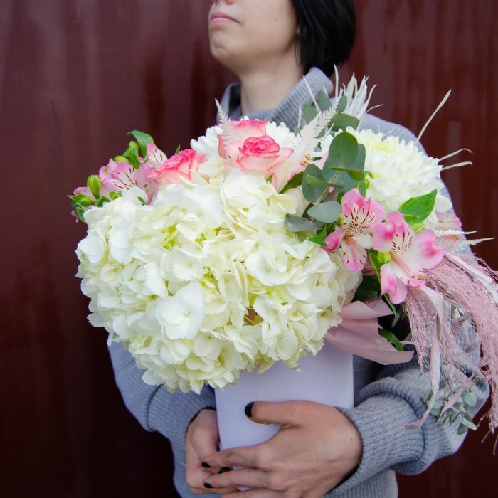 Гортензия – 1 шт. Роза – 3 шт. Альстромерия – 3 шт. Циперус – 2 шт. Папоротник – 1 шт.