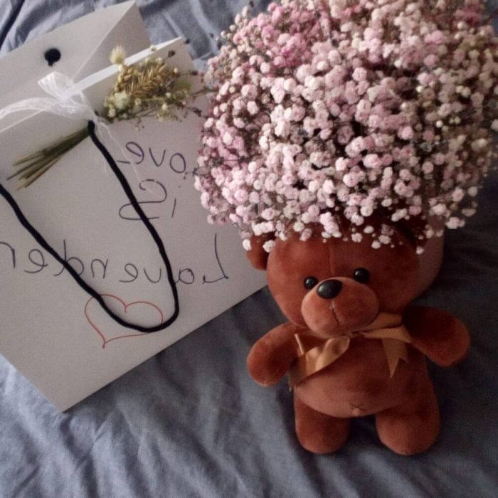 Гипсофила с лавандой в шляпной коробке с Мишкой
