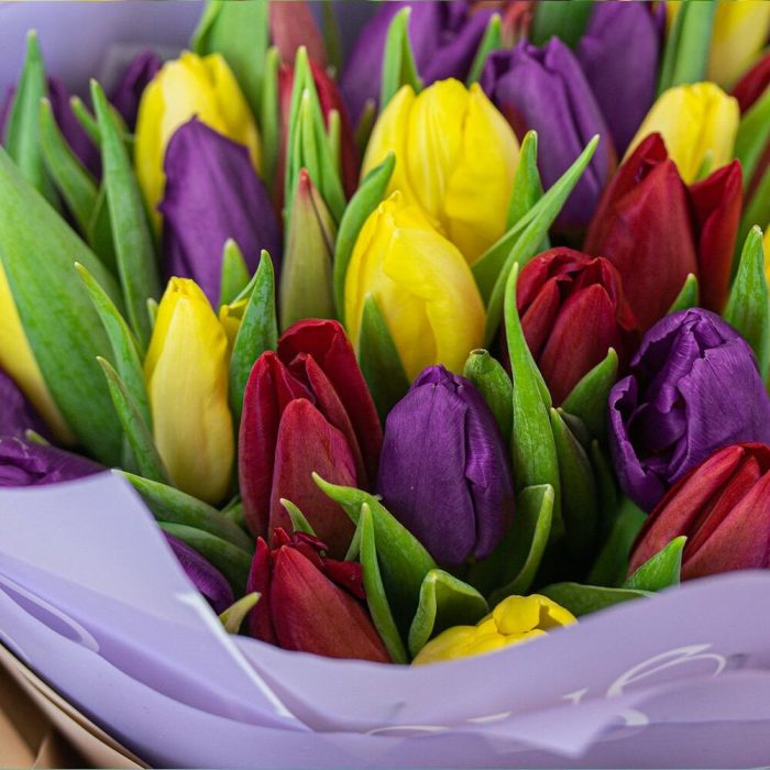 Букет из 35 тюльпанов стандарт яркий микс в упаковке
