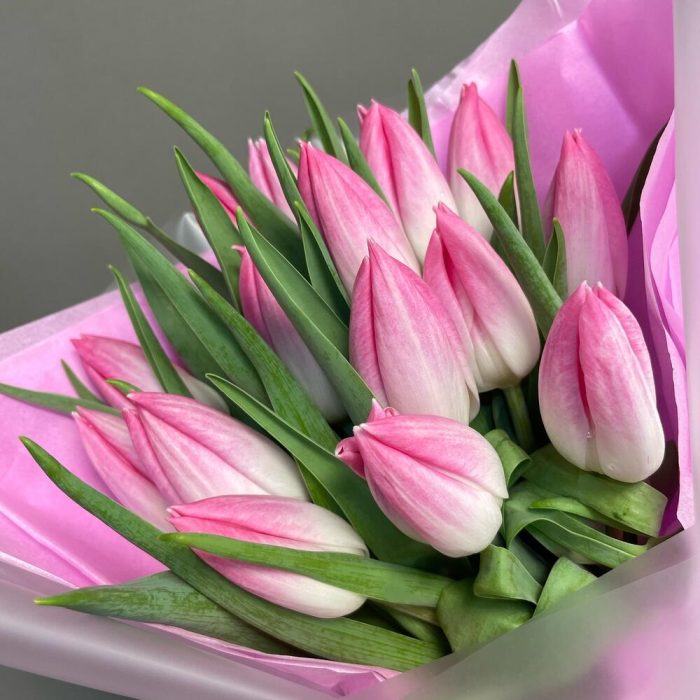 Тюльпан – 15 шт.Упаковка дизайнерская – 2 шт.ленты – 2 шт.