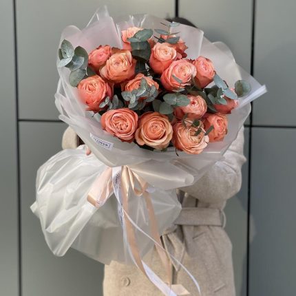 Букет из 15 роз сорта кахала и эвкалипта